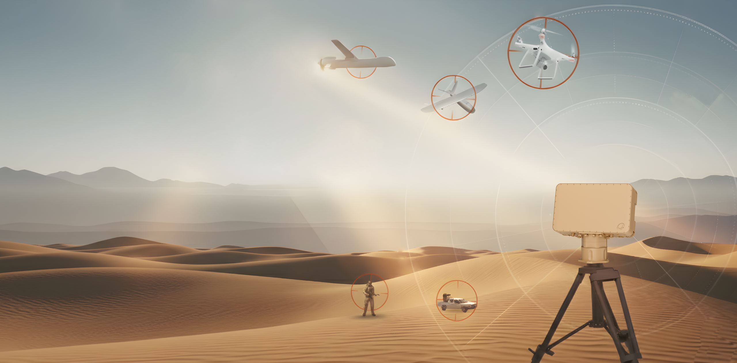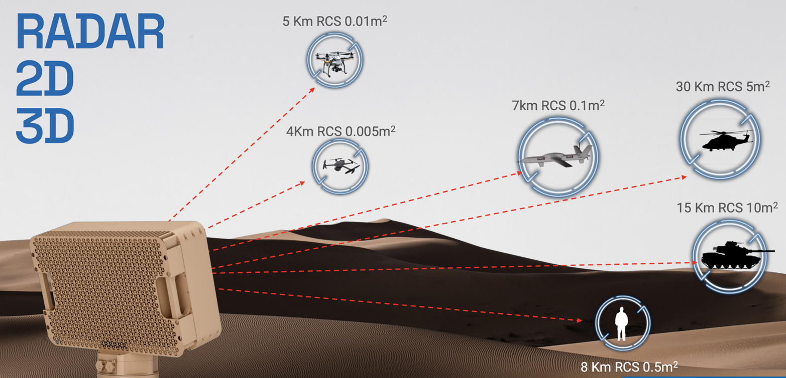 - Pulse Doppler AESA (active electronically scan array) 2D and 3D Radars
